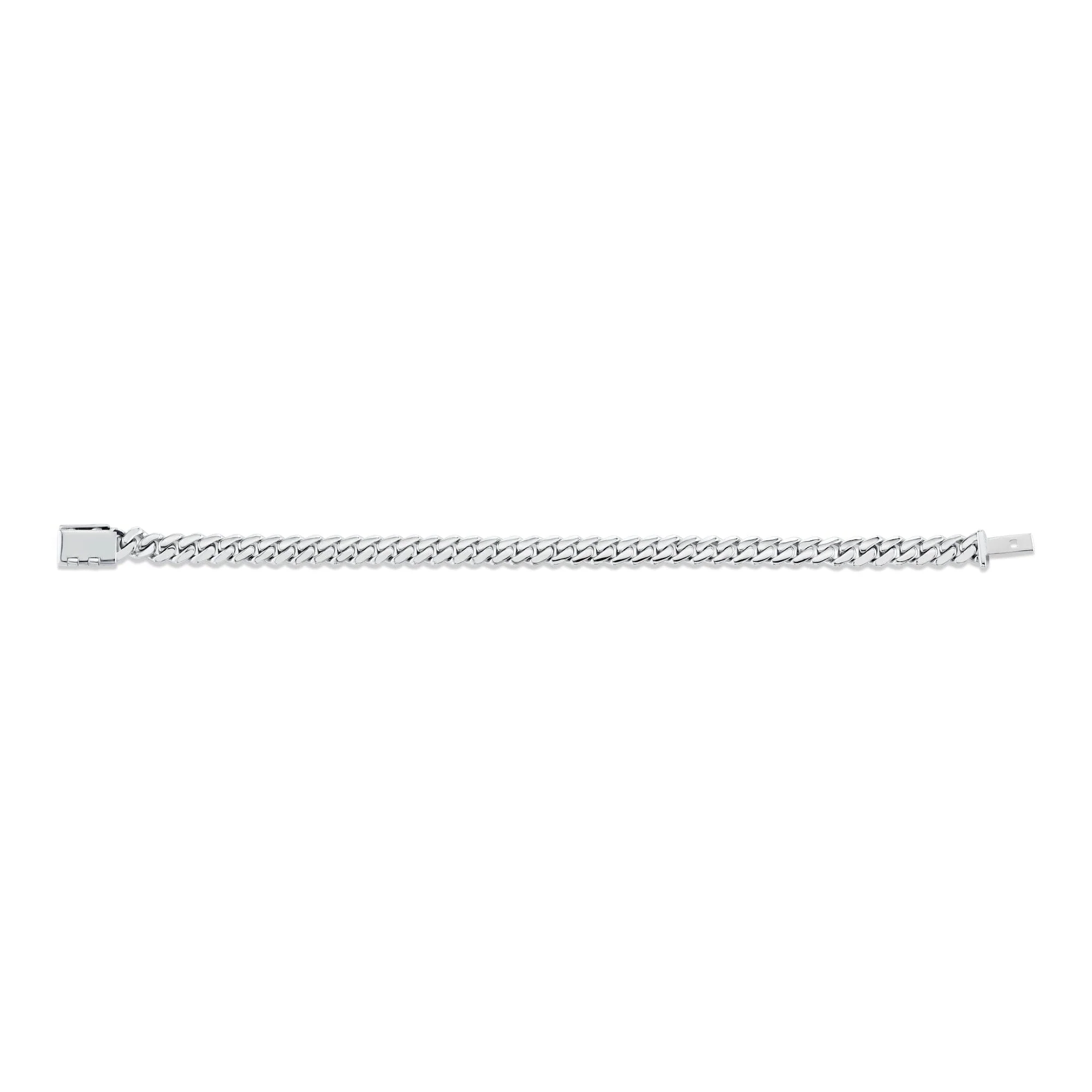 This men's Cuban chain bracelet showcases an 8mm wide Miami Cuban link design, delivering a striking yet elegant appearance. Offered in 7.5", 8", and 8.5" lengths, it fits comfortably on the wrist, making it suitable for both everyday and formal occasions. The bracelet features a custom box clasp for secure wear and a polished look. Its enduring design and robust build make it a perfect choice for those who value a blend of durability and style. Whether worn solo or layered, this chain brings a refined edge to any ensemble.
