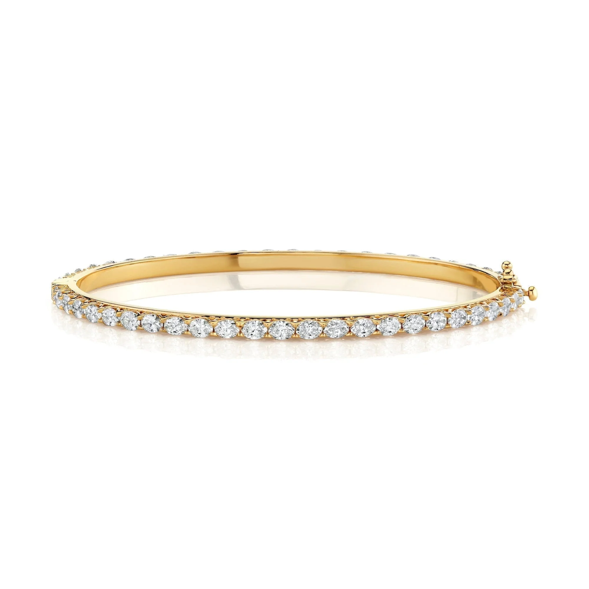 The Meksian Oval Tennis Bangle combines timeless elegance with expert craftsmanship. Featuring oval-cut diamonds, each stone is securely held in the unique patented Meksian "M" setting, ensuring both durability and a distinctive design. This bracelet offers a refined sparkle that complements any ensemble, making it an essential piece for those who appreciate classic style with a modern twist. Its meticulous construction guarantees lasting beauty and comfort, perfect for daily wear or special occasions. Elevate your jewelry collection with this expertly crafted symbol of sophistication and grace.