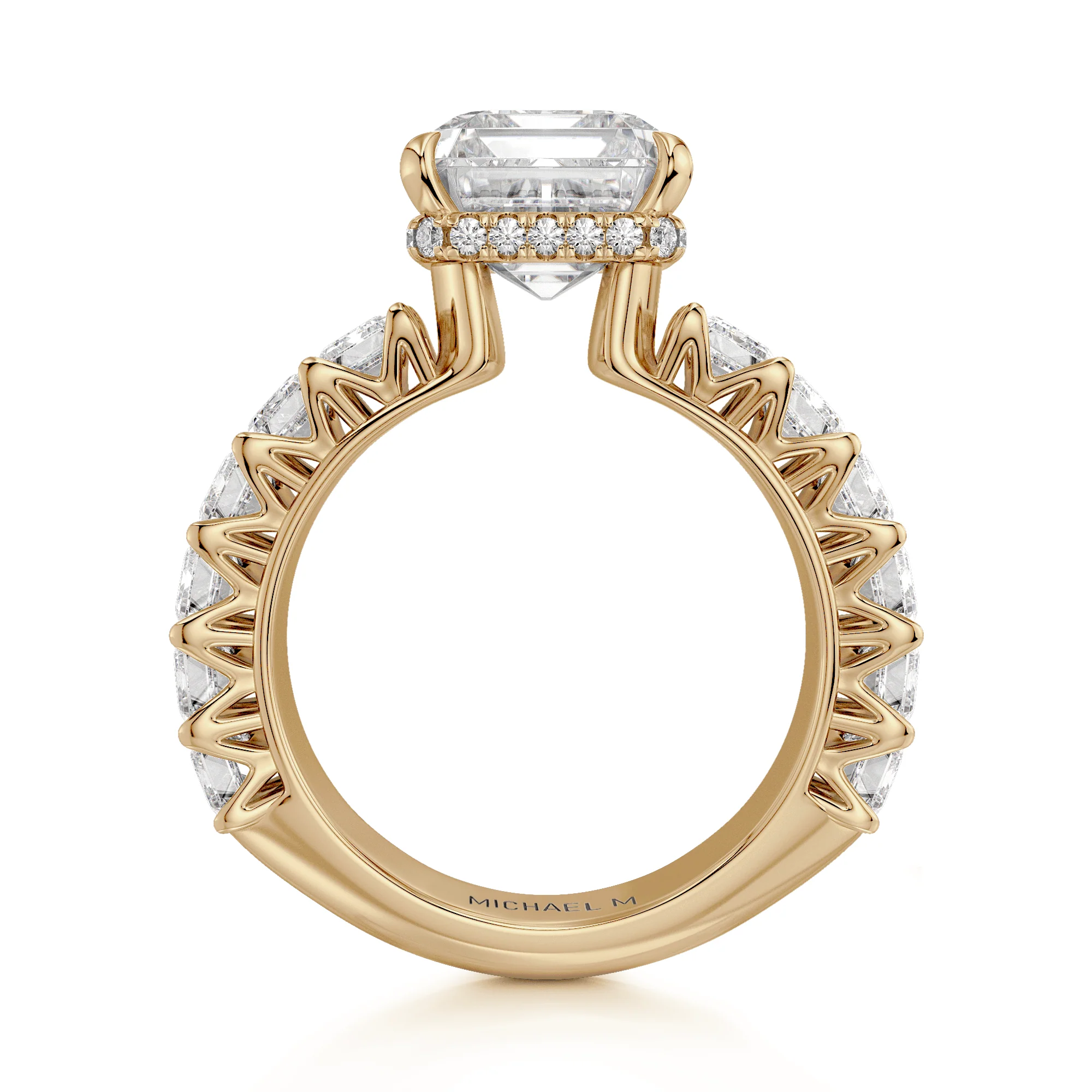 This MICHAEL M engagement ring is adorned with side diamonds handpicked by a certified MICHAEL M gemologist, each side stone has a minimum average color of G, a minimum average clarity of VS, and are hand-placed in an elegant prong setting by one of MICHAEL M’s master artisans.