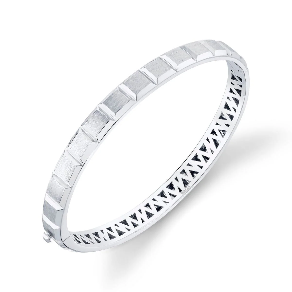 With a brushed finish, this men's beveled block bracelet makes a bold, structured statement. The refined beveled sides create a masculine style, mimicking architectural design. The interior showcases the Michael M signature gallery.