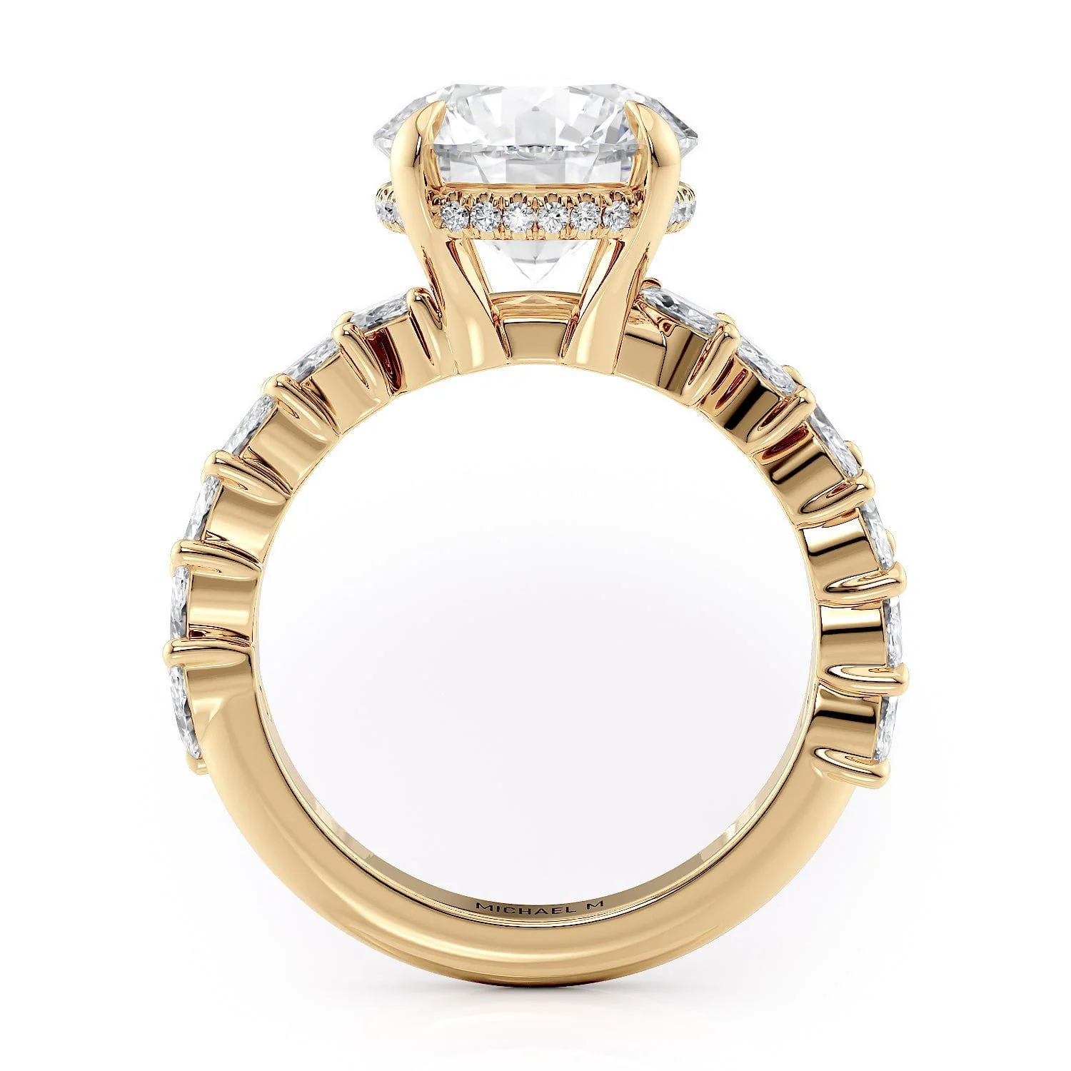 This MICHAEL M engagement ring is adorned with side diamonds handpicked by a certified MICHAEL M gemologist, each side stone has a minimum average color of G, a minimum average clarity of VS, and are hand-placed in an elegant prong setting by one of MICHAEL M’s master artisans.