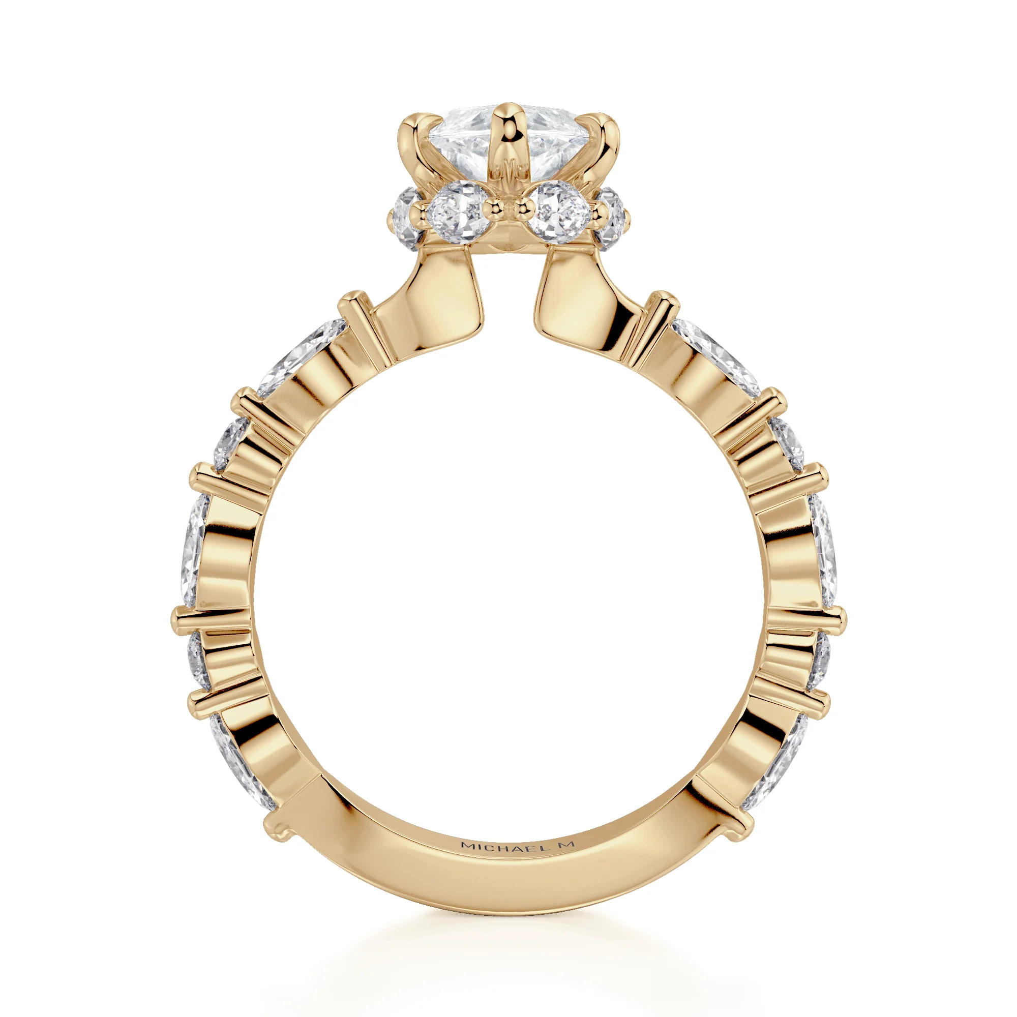This MICHAEL M engagement ring is adorned with side diamonds handpicked by a certified MICHAEL M gemologist, each side stone has a minimum average color of G, a minimum average clarity of VS, and are hand-placed in an elegant prong setting by one of MICHAEL M’s master artisans.